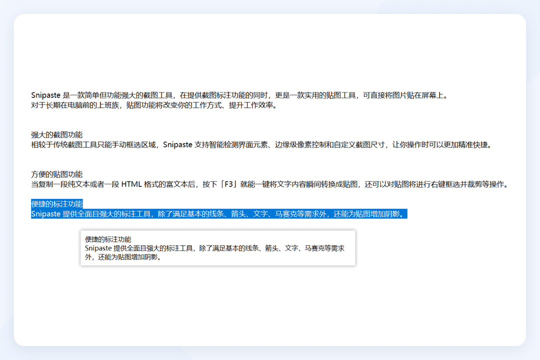 Snipaste 提供全面且强大的标注工具,除了满足基本的线条、箭头、文字、马赛克等需求外,还能为贴图增加阴影。